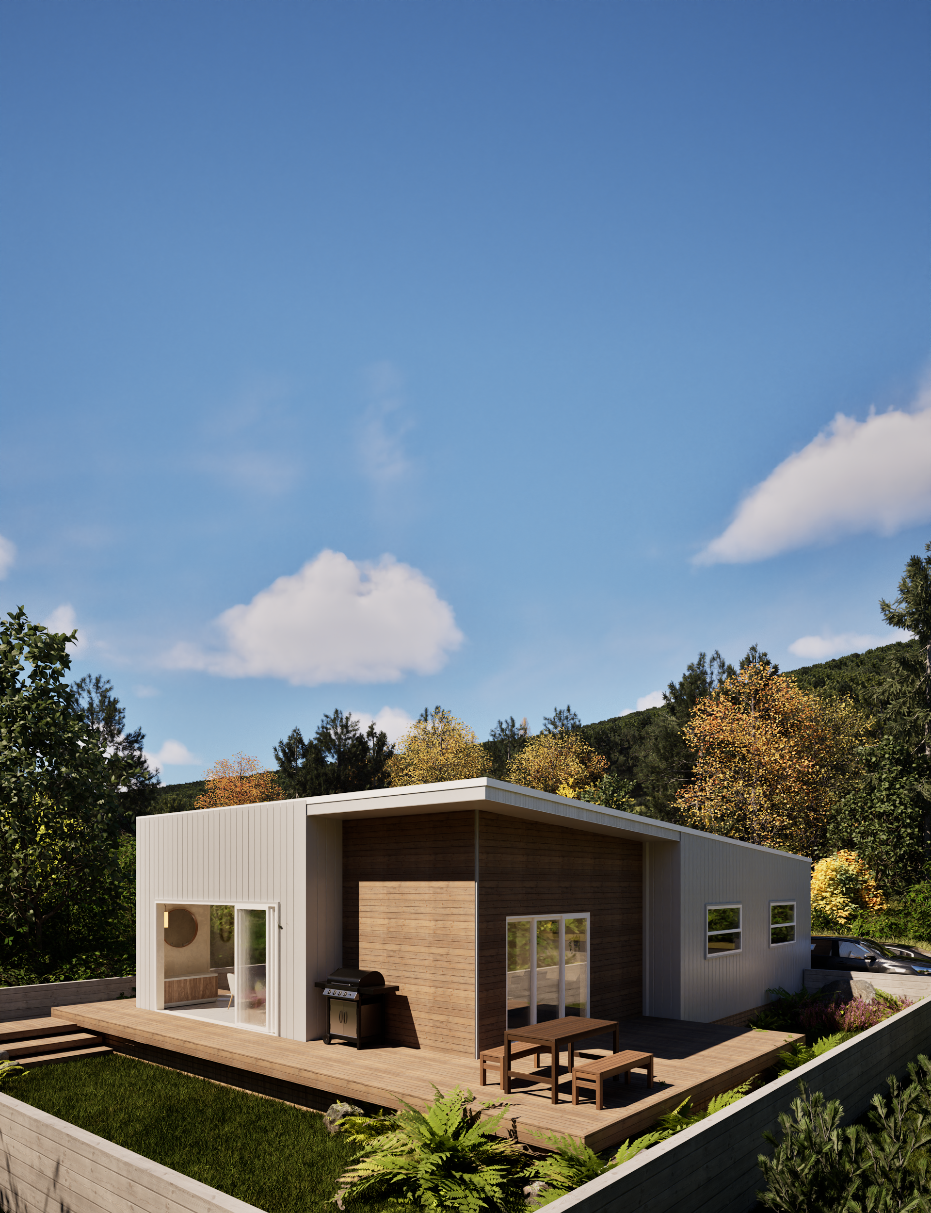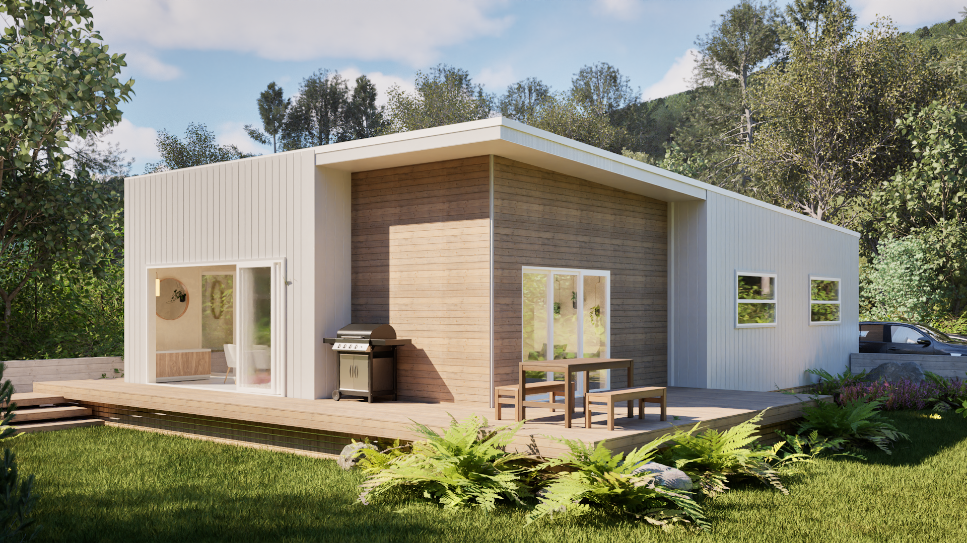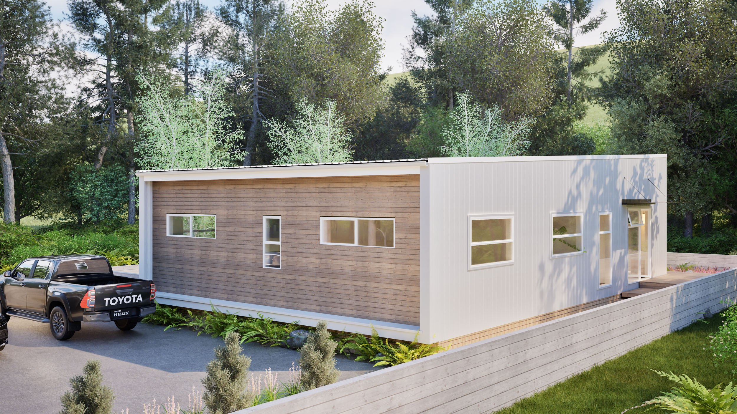 Its sleek, contemporary form is defined by clean lines and a distinctive slanted roof, creating a modern profile that sits comfortably in a range of environments. Designed with flexibility in mind, Tide can be upgraded to include a garage or home office, allowing the home to adapt as your needs change.
